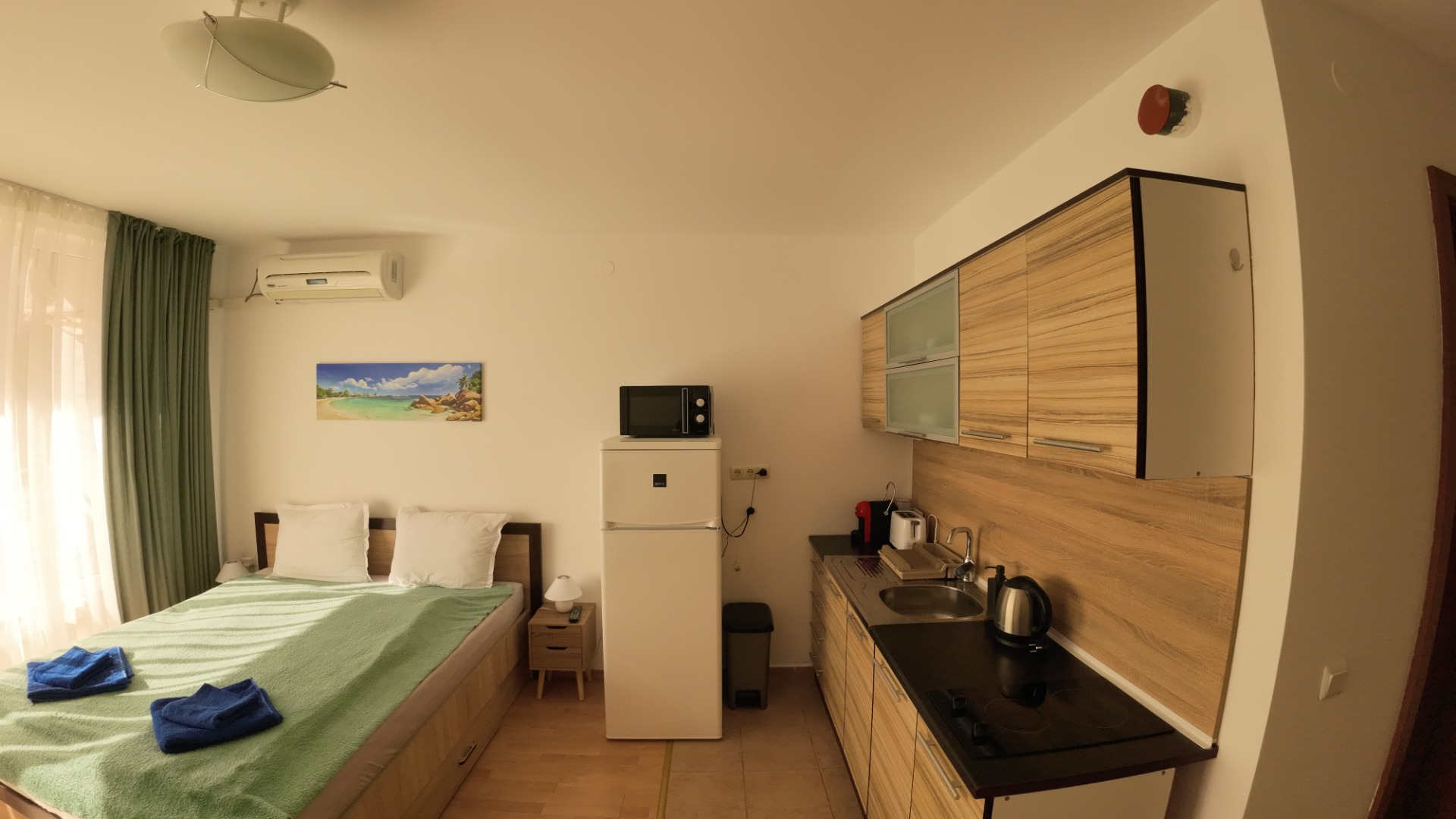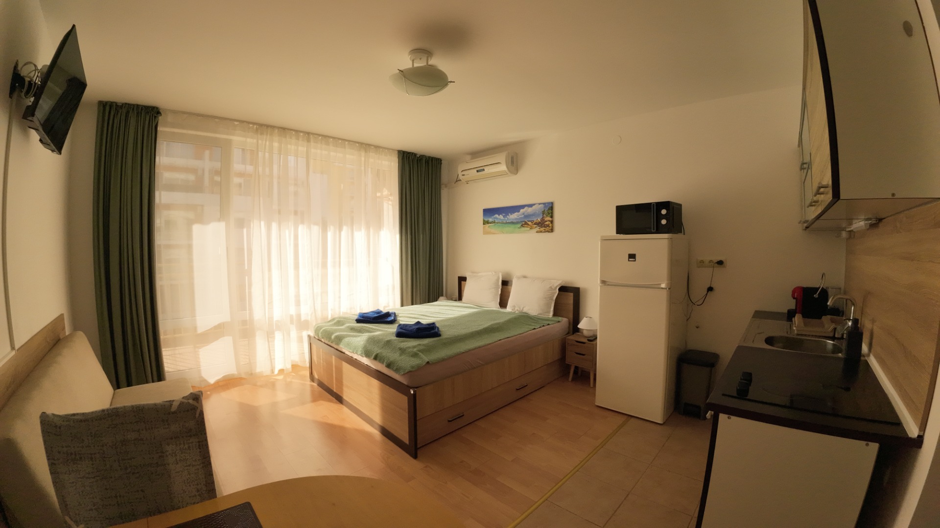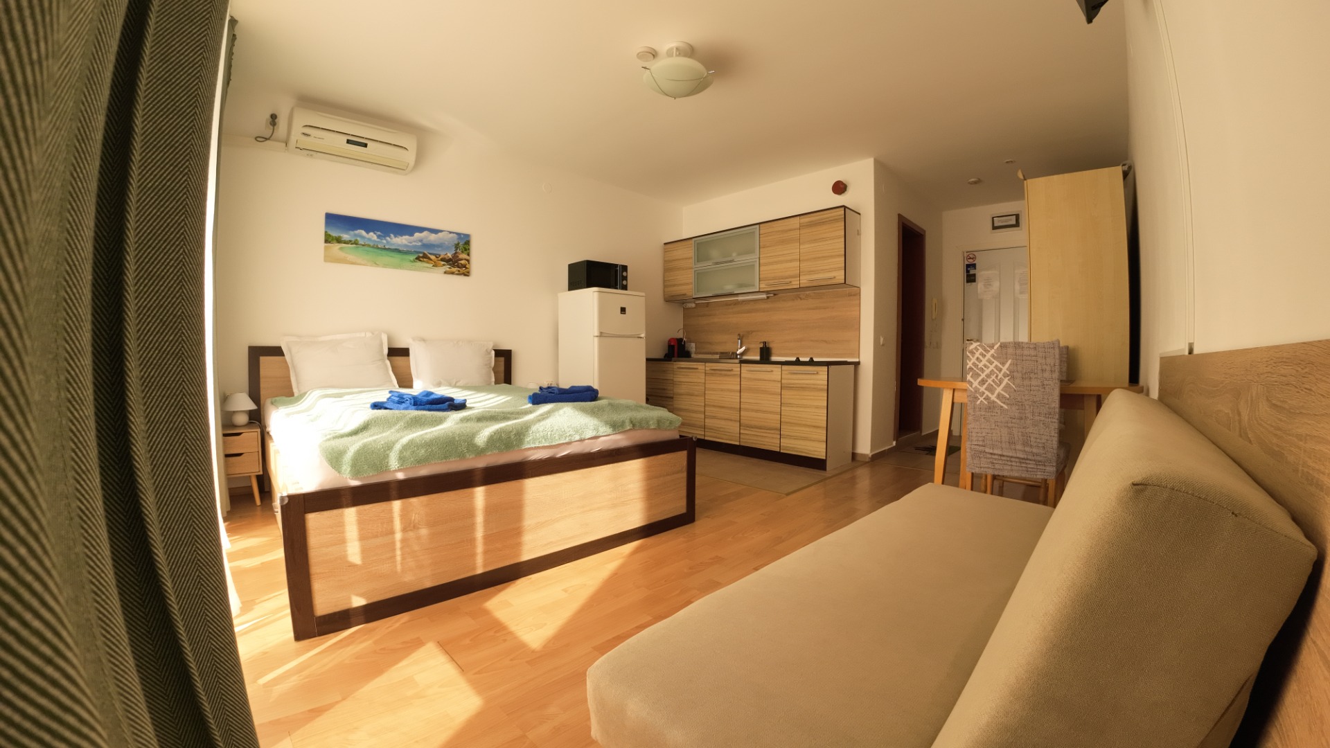 Studio (bedroom with a large double bed, sofa bed + kitchen in the room, bathroom with toilet and balcony). The entire apartment is air-conditioned.