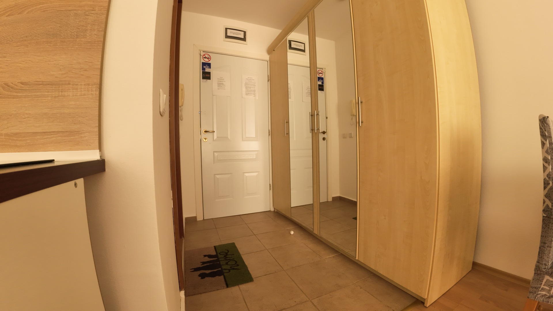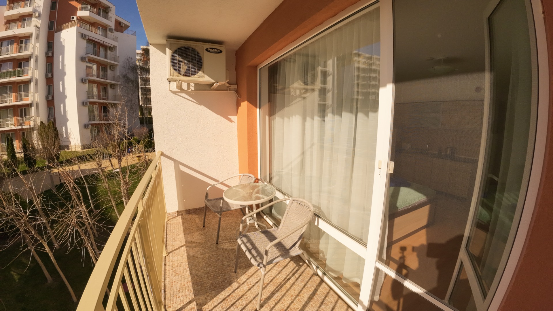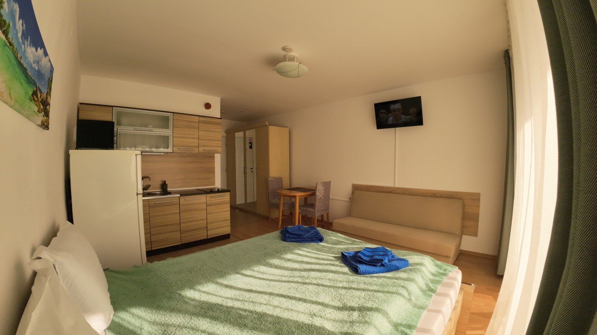 Studio (bedroom with a large double bed, sofa bed + kitchen in the room, bathroom with toilet and balcony). The entire apartment is air-conditioned.