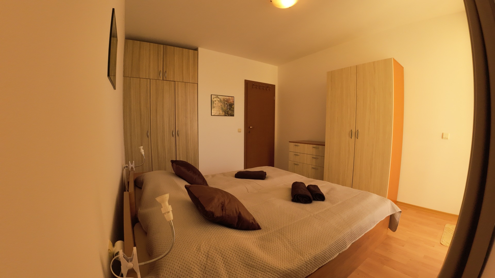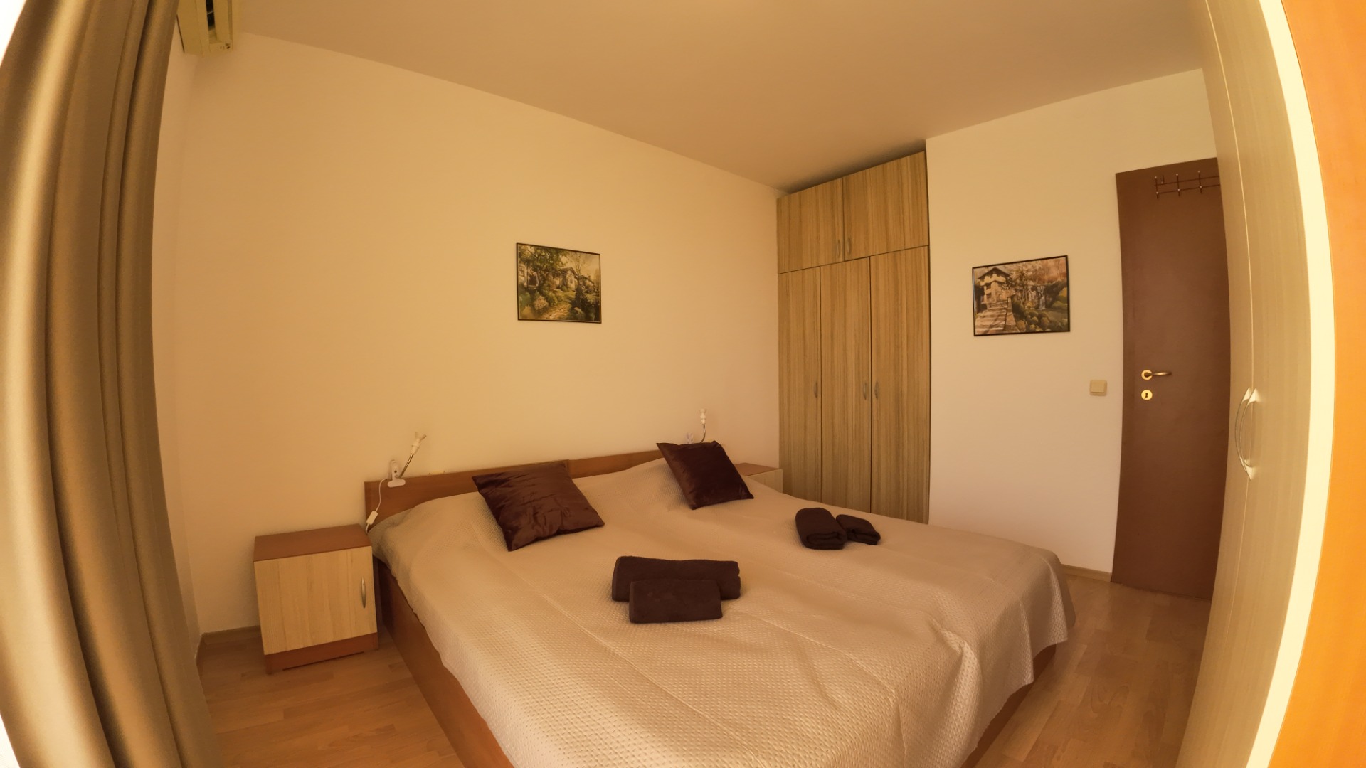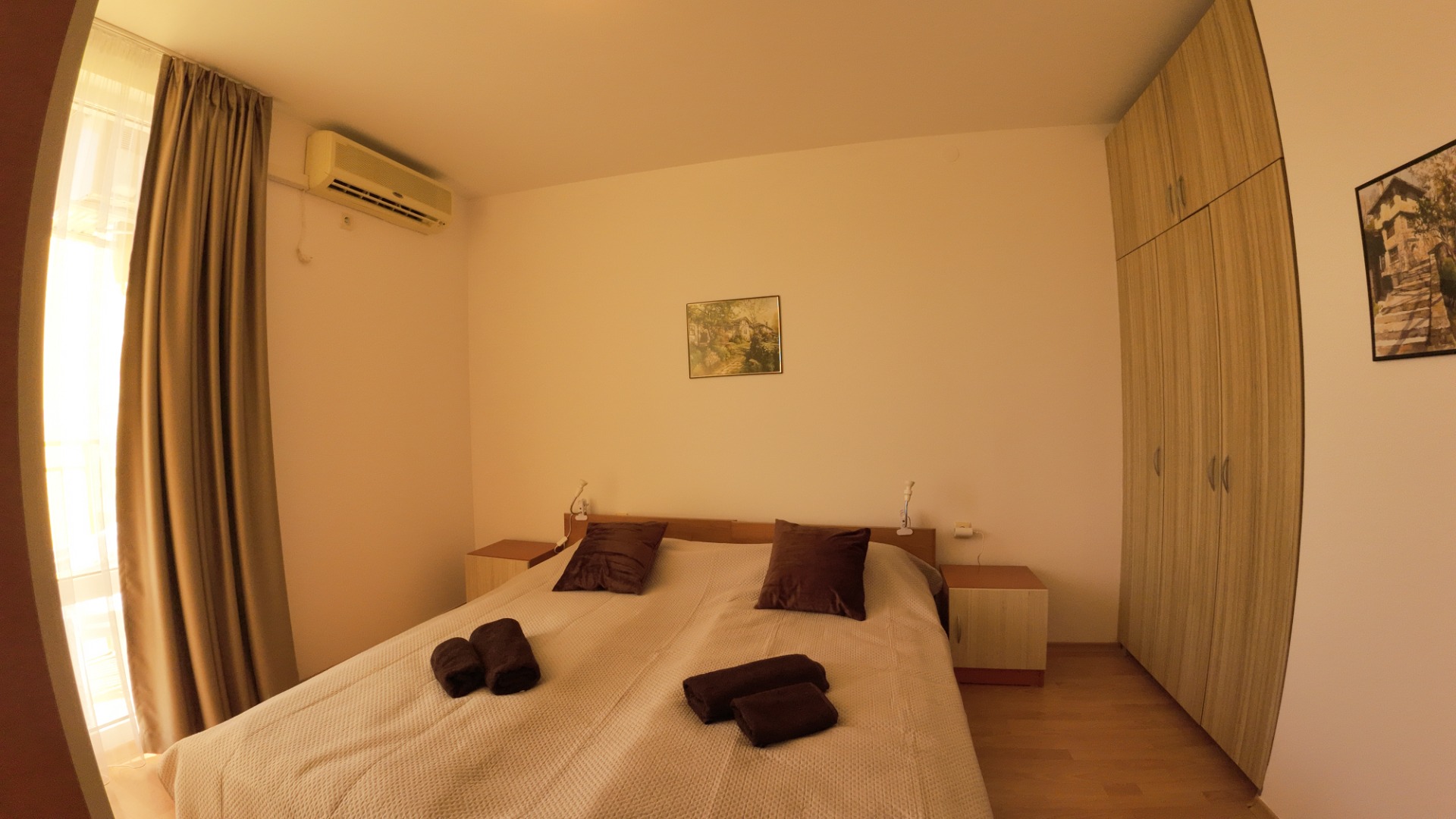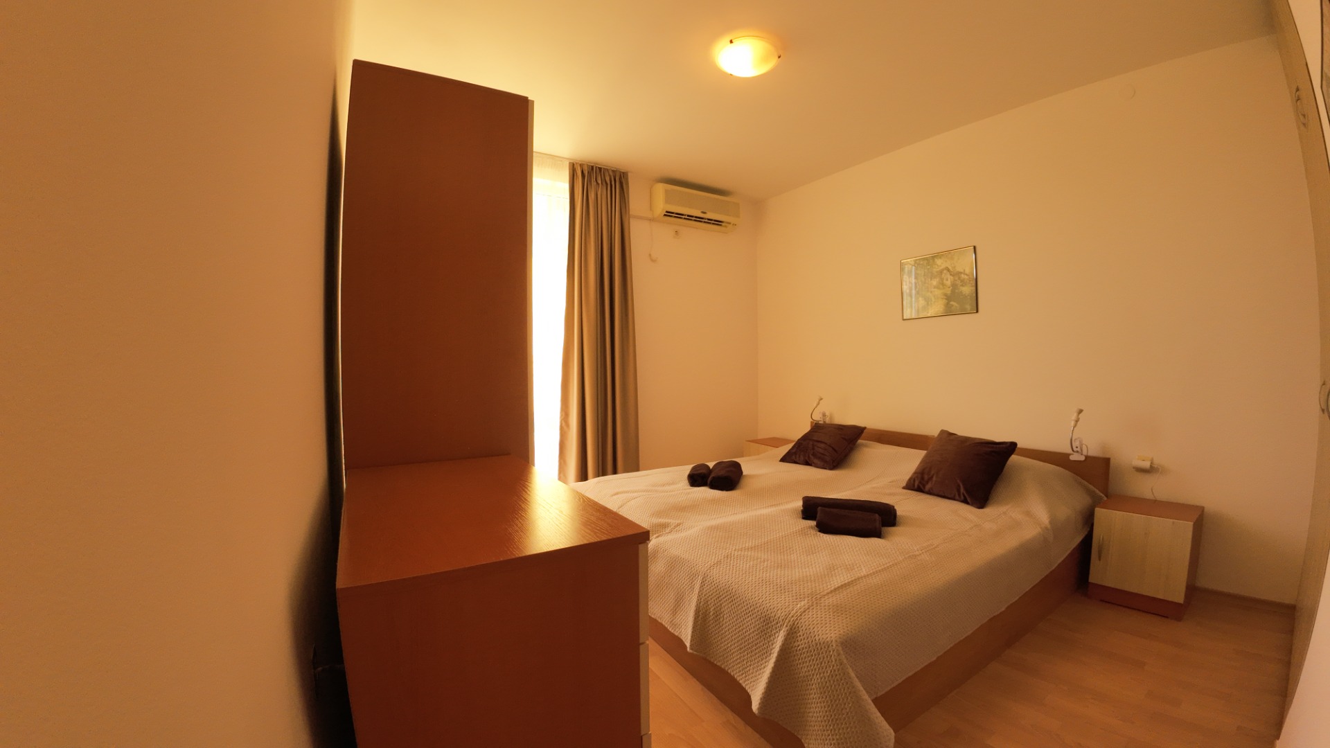 Apartment (1 bedroom with a large double bed, 1 bedroom with two single beds, kitchen with sofa bed + 2 extra beds for children available, bathroom with toilet and balcony). The entire apartment is air-conditioned.