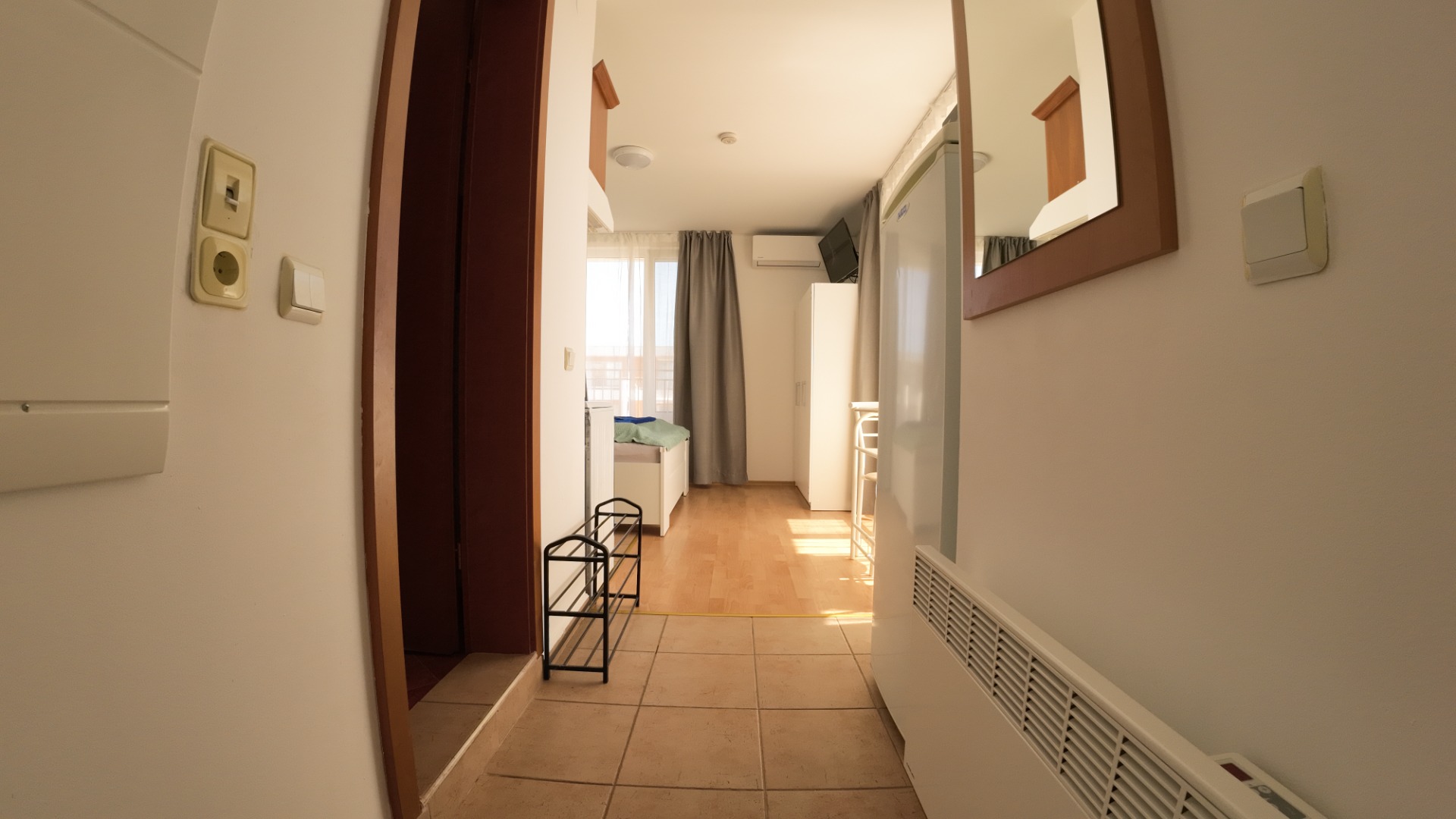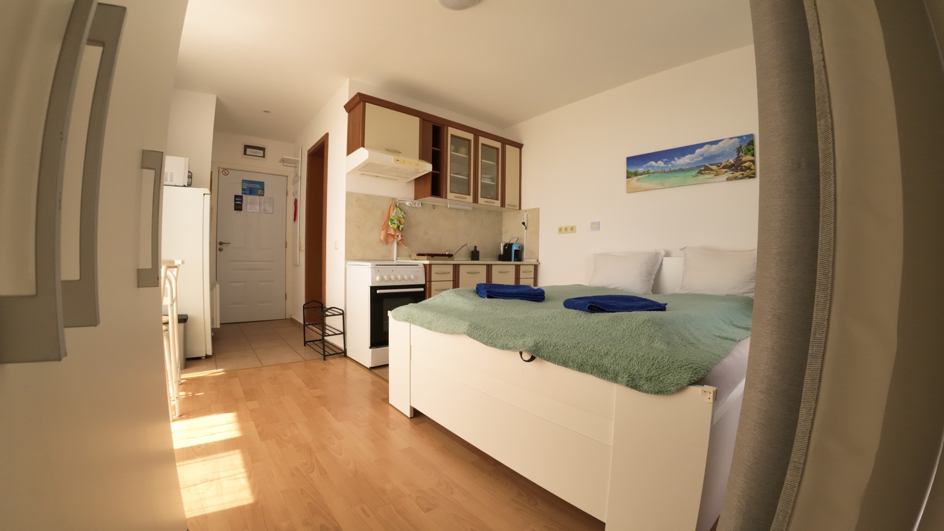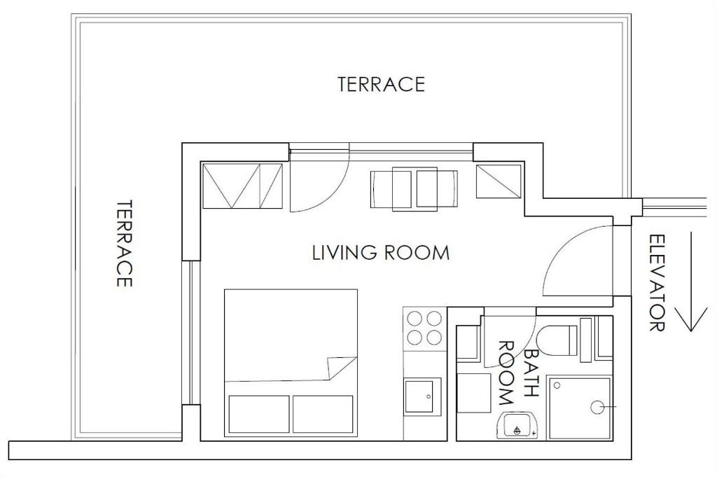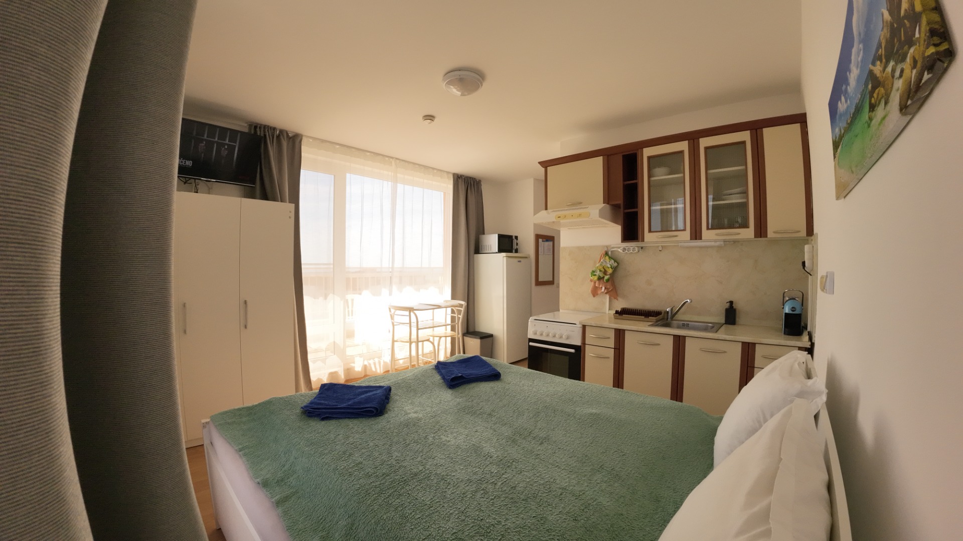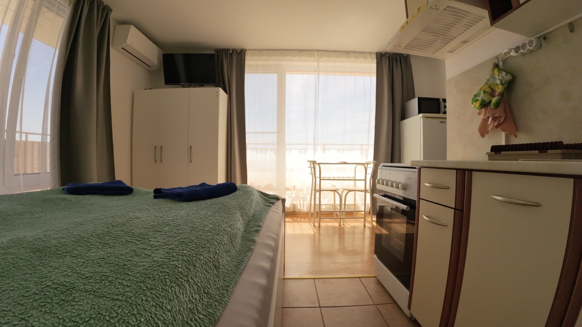 Studio (bedroom with a large double bed + kitchen in the space of the room, bathroom with toilet and large terrace). The entire space is air-conditioned.